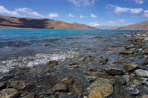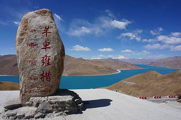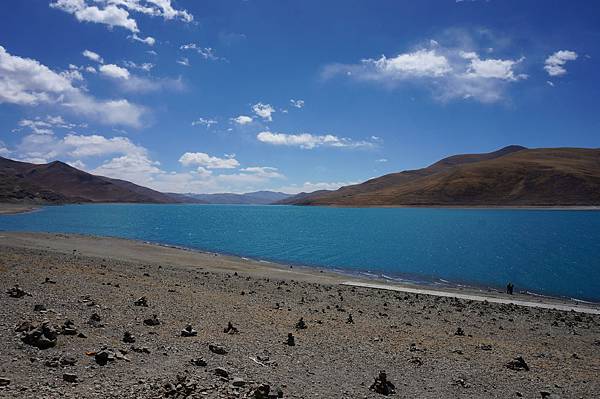 吉普車往山下駛,離羊湖越來越近,今天很幸運地不需要門票,就可以近距離的觀賞,看那湖面波光粼粼,映著陽光閃耀著,加上天空白雲點綴,好動人!!湖邊瑪尼石堆,各個都是懷抱信仰的雙手堆積而成的;遠方的念青康藏雪山,卻也獨樹一格的白雪靄靄在山頭,此時此景,真是令人流連忘返!!