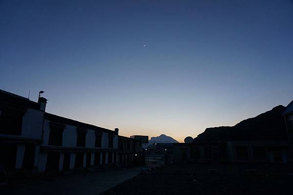 吉普車緩緩開下山,在這海拔4500公尺的定日歇腳,隨著夕陽泛紅,夜幕來臨,月亮緩緩升空,但實則已接近九點,該是休息的時候了。攝氏4、5度沒有暖氣的夜裡,窩在厚重的被子下,等待著明天的日出,明天的珠峰~